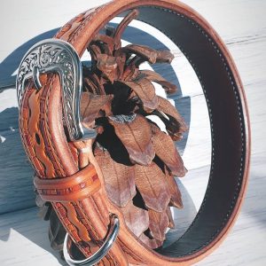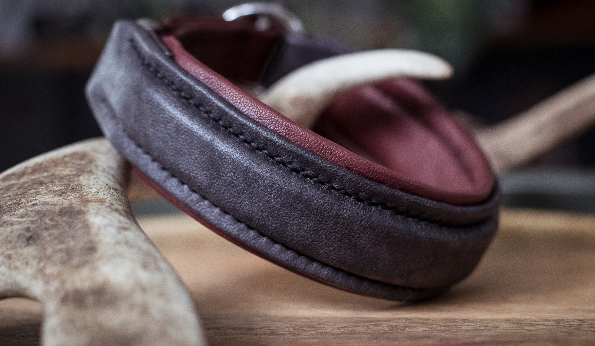 Die Polsterung ist aus einem dunkelroten Glatt-Ziegenleder. Beides zusammengenäht mit einen passenden schwarzen gewachsten Garn, mittels der stabilen Sattlernaht.