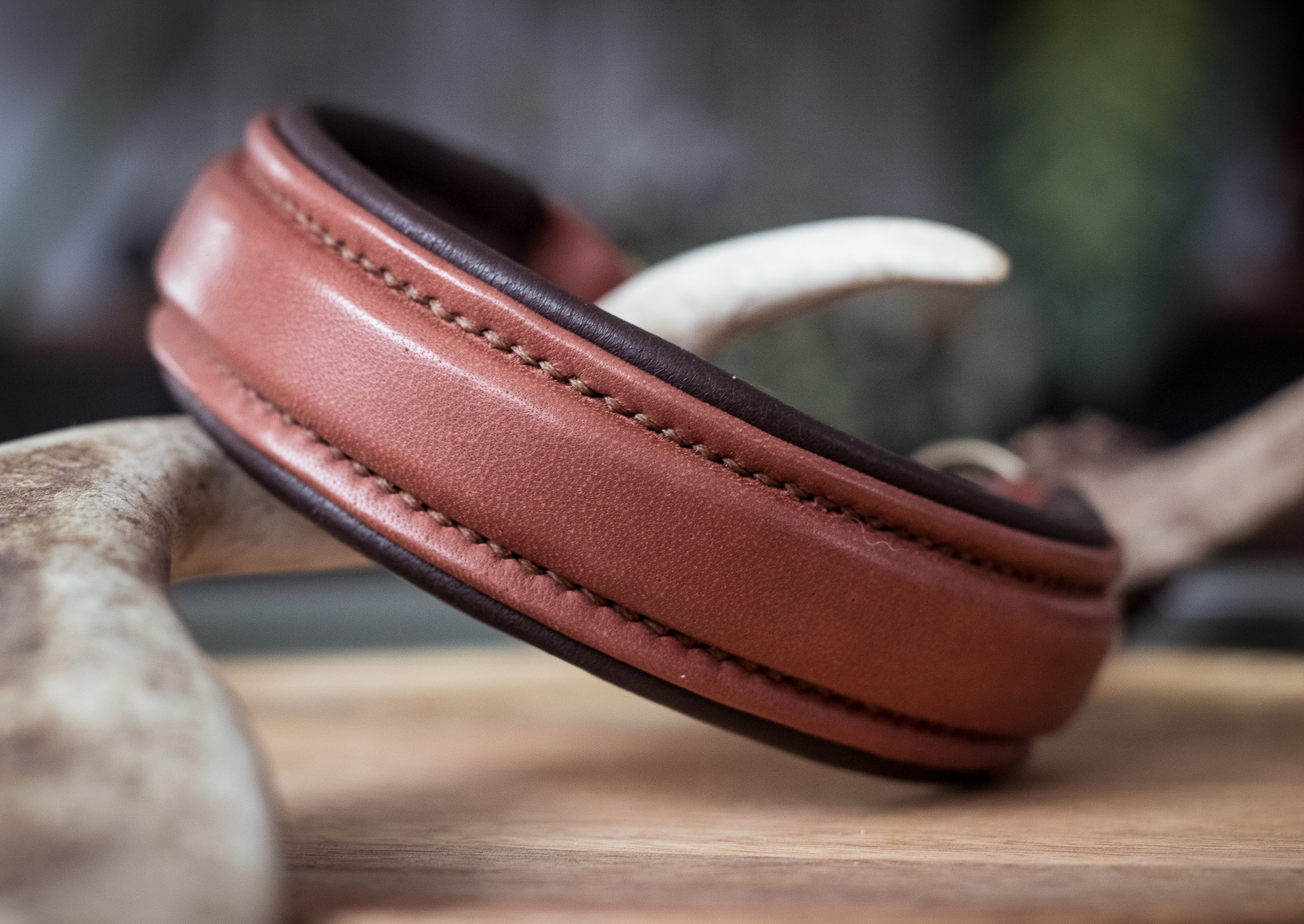 Die Polsterung ist aus einem braunem Elchleder. Beides zusammengenäht mit einen passenden braunem gewachsten Garn, mittels der stabilen Sattlernaht.